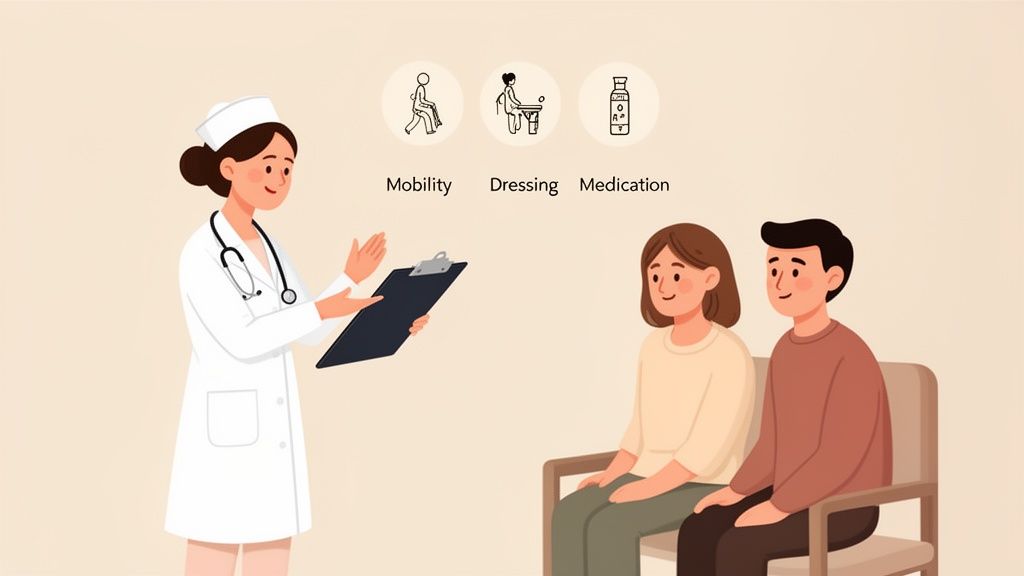 The evaluation focuses on Activities of Daily Living (ADLs), a checklist of basic skills for independent living. The nurse will ask gentle questions about: