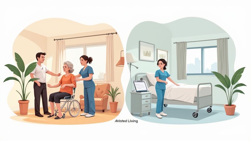 Getting a handle on the fundamental distinctions is the first step toward making a confident decision. Here in Ohio, the official term for "Assisted Living" is a Residential Care Facility (RCF), and a "Nursing Home" is called a Skilled Nursing Facility (SNF). People often use the terms interchangeably, but from a licensing and care perspective, they are worlds apart. You can explore a more detailed breakdown in our guide to skilled nursing versus assisted living.
