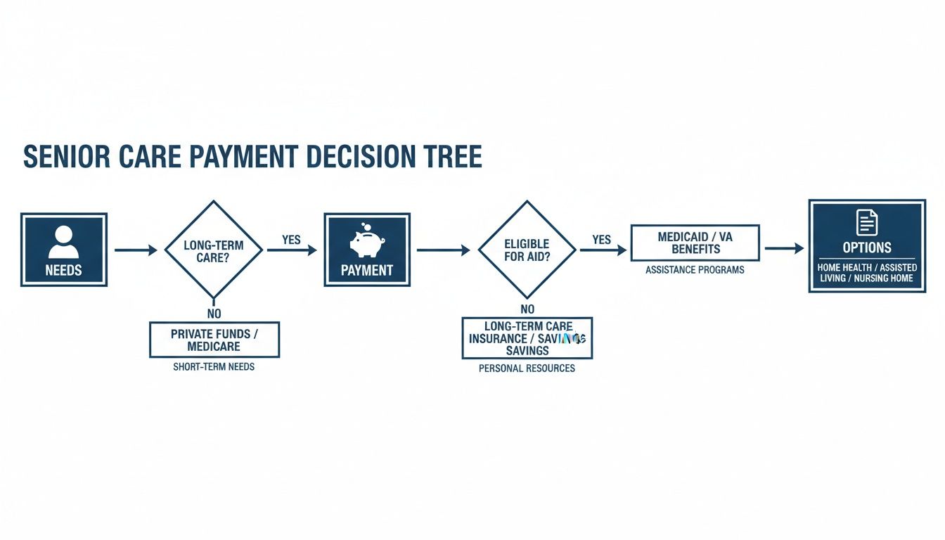 As the chart shows, the journey starts with an honest assessment of daily and medical needs. That assessment then points you toward the viable payment methods and, ultimately, the right type of community.