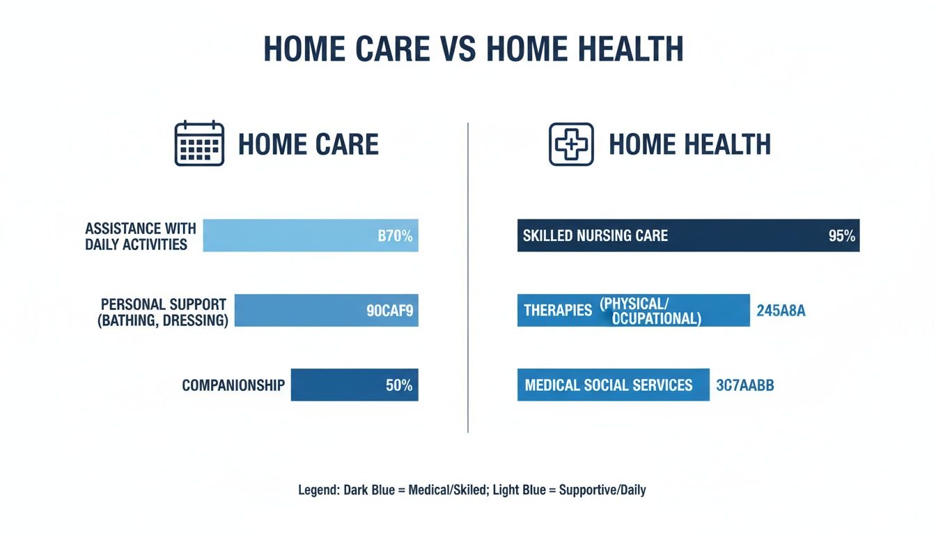 Know the Difference: "Home Care" is non-medical help (bathing, meals, safety) that you pay for privately. "Home Health" is skilled nursing or therapy ordered by a doctor and often covered by Medicare for a short time. Most families need Home Care.
