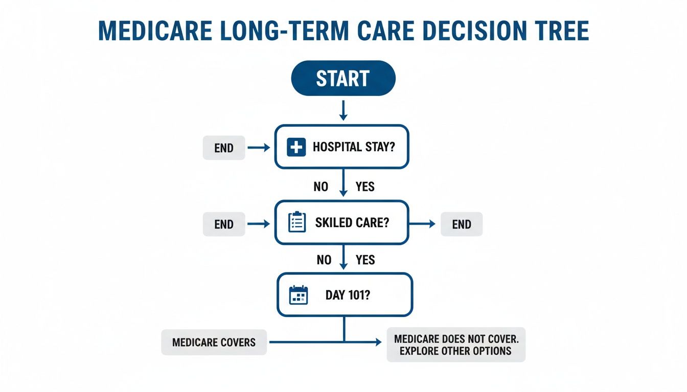 This decision tree shows just how different Medicare's path is—it’s entirely focused on a qualifying hospital stay and the need for skilled care, not the long-term custodial care most seniors eventually need.