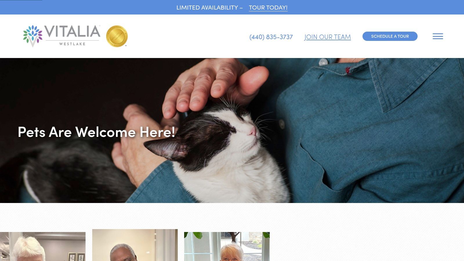 | VITALIA Westlake | Moderate: modern operations with pet‑focused visits 🔄 | Part of Arrow Senior Living; contact for exact costs and pet rules ⚡ | Contemporary amenities, pro‑pet messaging; good resident experience potential ⭐⭐⭐⭐ 📊 | Pet owners seeking newer‑feel community near West Side amenities | "Pets welcome" policy, dedicated pet tours, updated amenities |
